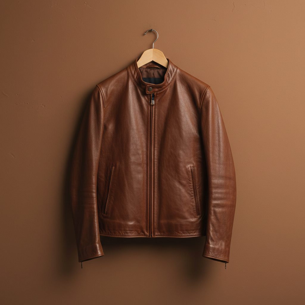 The minimalist café racer — band collar, snap closure, clean lines. Deep chocolate brown lambskin that ages like good leather should.