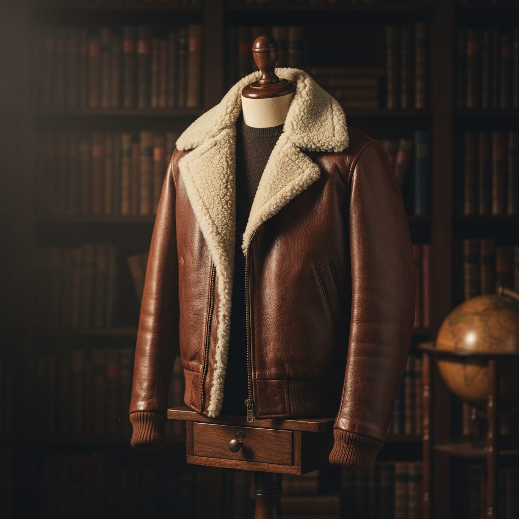 A heritage aviator in deep tobacco lambskin. Shearling-trimmed collar, ribbed cuffs, two-way YKK zip. Built to outlast you.